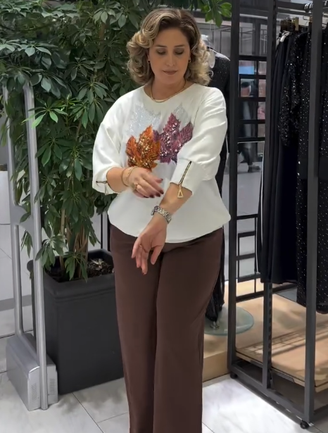 Nadýchaný svetřík v krémové barvě okouzlí svou uvolněnou elegancí. Skrývá však rafinovaný detail: potisk javorových listů se třpytivými perlovými korálky, který připomíná zlatavé podzimní listí rozseté v lesním světle. S každým pohybem zachytí jemné odlesky.✨